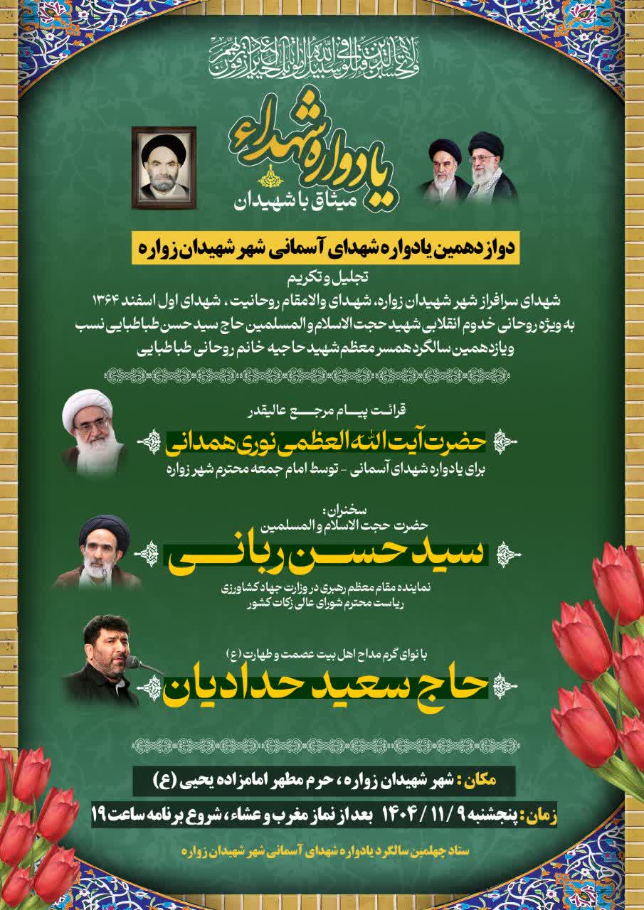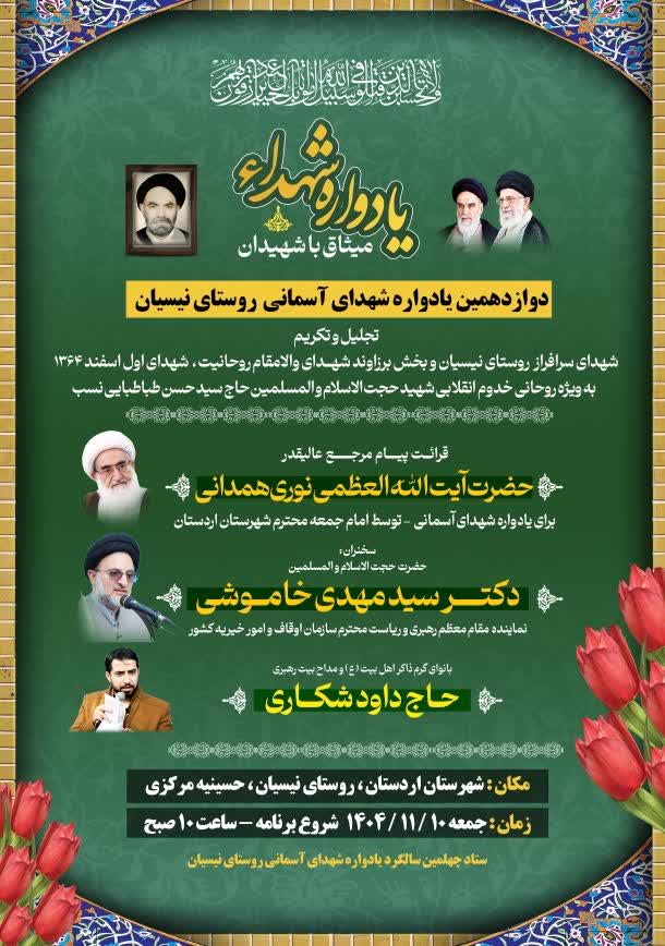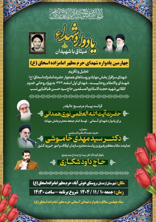 برنامه ستاد یادواره شهدای آسمانی 1404 ۰۷ بهمن ۱۴۰۴ نورالائمه ، حجت الاسلام طباطبایی نسب ، مراسمها ، دیدار بسم الله الرحمن الرحیم برنامه ستاد یادواره شهدای آسمانی ها (فصل زمستان)1404 شهرستان اردستان _ زوارهشهرستان اردستان _ روستای نیسیان شهر مهاباد_ روستای خوش آباد _ آستان مقدس امامزاده اسحاق